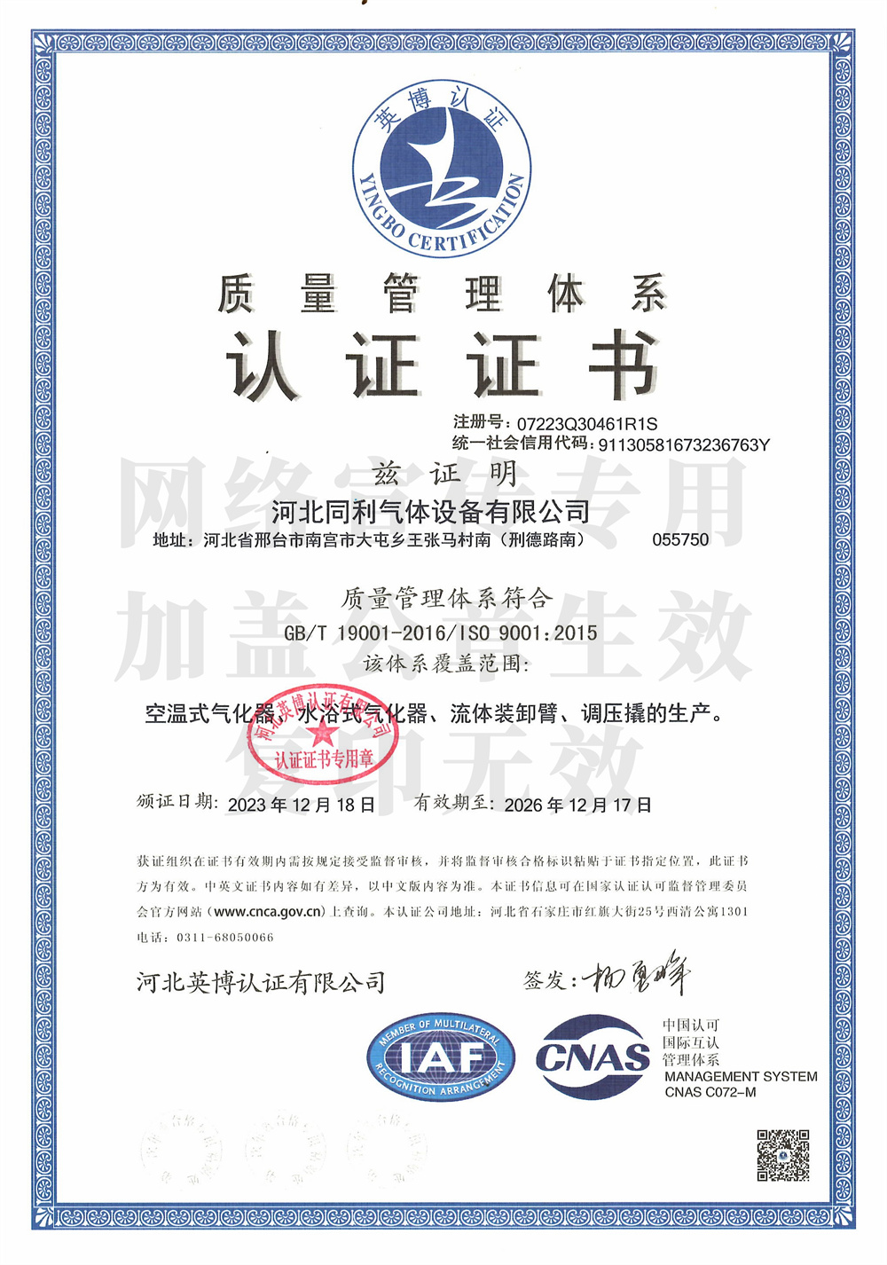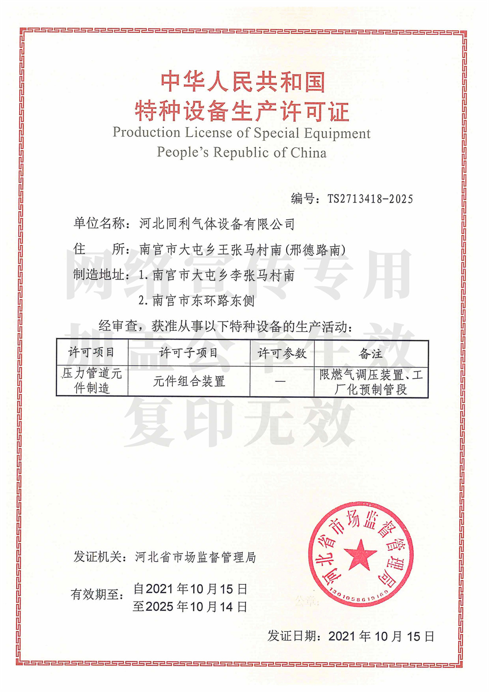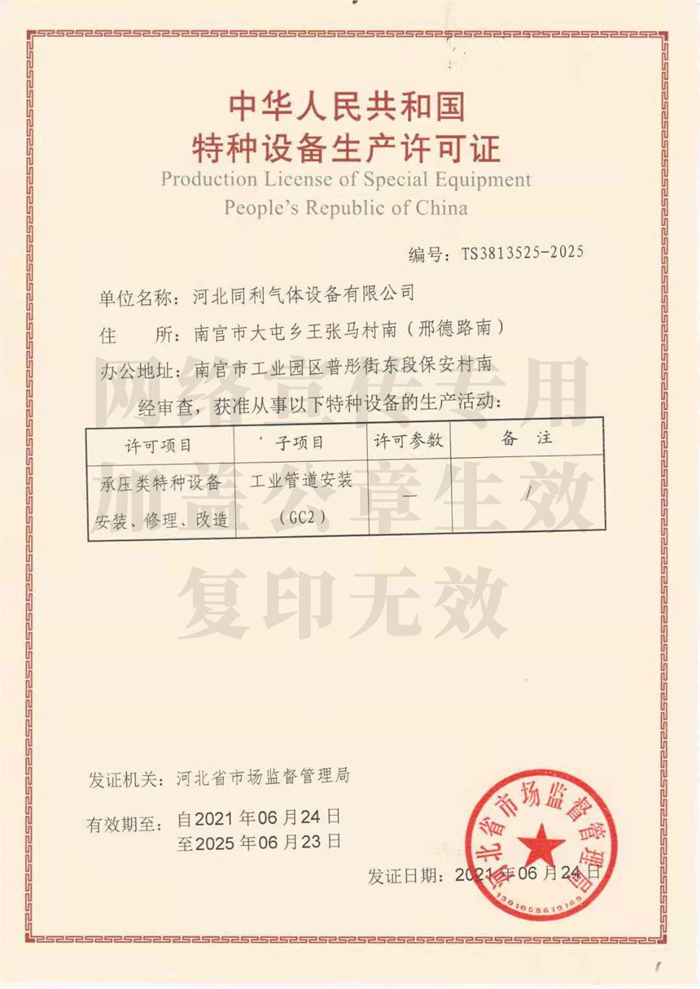 • 河北同利是省级“专精特新”小巨人企业,河北省“高新技术企业”,并相继通过了ISO9001质量管理体系认证、ISO14001环境管理体系认证、ISO45001职业健康安全管理体系认证等管理体系,公司严格遵守OCIMF和BSI1474国际行业标准拥有压力管道元件制造(燃气调压装置及工厂化预制管段)、承压类特种设备安装、修理、改造及压力容器制造项目的中华人民共和国特种设备生产许可证我公司投运产品已运用遍及全球,为液化工厂、LNG接收站、LNG储备站、其他公司、化工企业、造纸厂、钢铁公司、机械制造及玻璃厂等国内外多家公司提供了多套设备及工程技术服务,是中国石油、中国石化、中国海油、中国燃气、华润燃气、新奥能源、中集安瑞科和多家国际知名EPC及石油公司的合格供应商。产品稳定的性能和合理的价格受到业内专家和用户的一致好评,产品销售覆盖中国及海外东南亚、欧洲、非洲等十几个国家。公司拥有一支经验丰富、注重实效、作风严谨,业务精湛、创新能力强的科研设计队伍,拥有各项专利技术十多项。