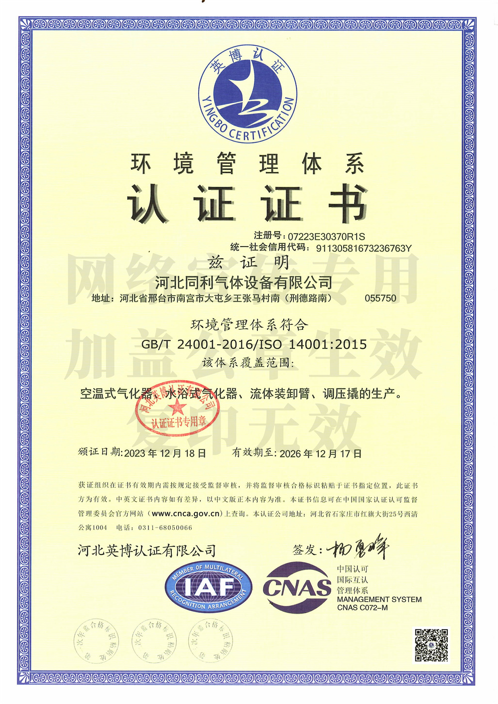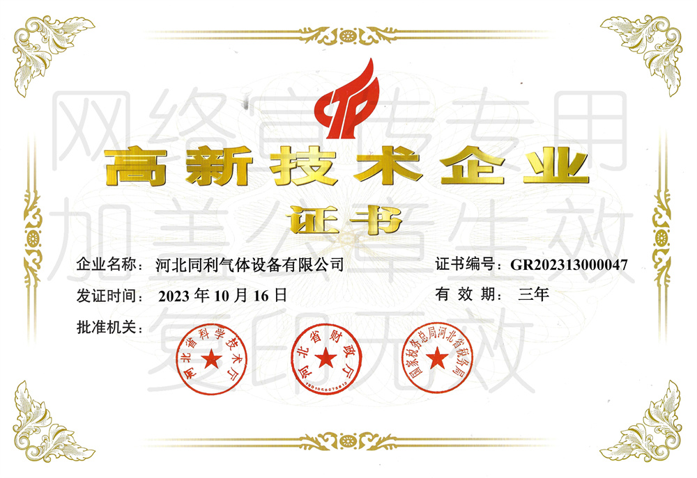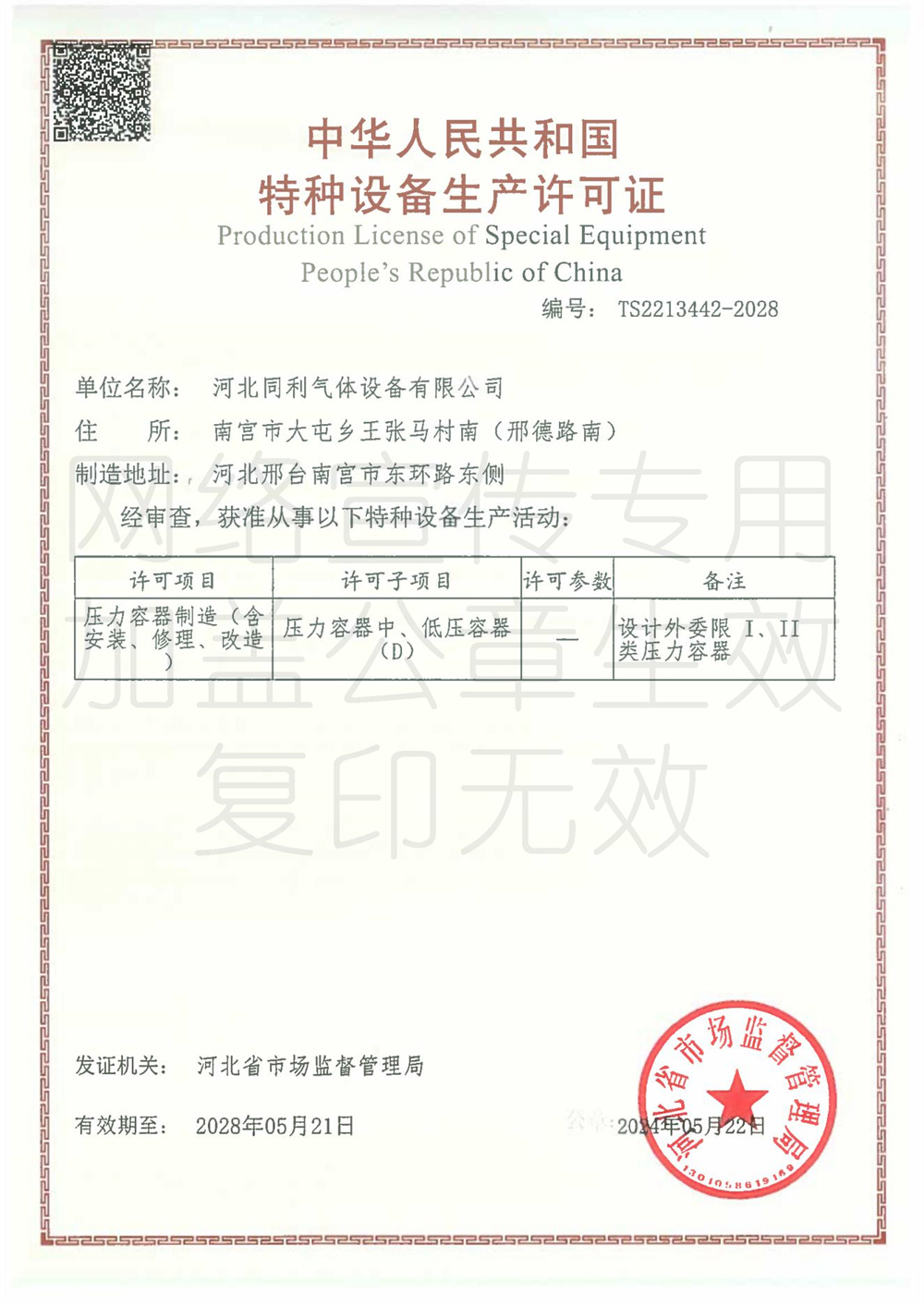 • 河北同利是省级“专精特新”小巨人企业,河北省“高新技术企业”,并相继通过了ISO9001质量管理体系认证、ISO14001环境管理体系认证、ISO45001职业健康安全管理体系认证等管理体系,公司严格遵守OCIMF和BSI1474国际行业标准拥有压力管道元件制造(燃气调压装置及工厂化预制管段)、承压类特种设备安装、修理、改造及压力容器制造项目的中华人民共和国特种设备生产许可证我公司投运产品已运用遍及全球,为液化工厂、LNG接收站、LNG储备站、其他公司、化工企业、造纸厂、钢铁公司、机械制造及玻璃厂等国内外多家公司提供了多套设备及工程技术服务,是中国石油、中国石化、中国海油、中国燃气、华润燃气、新奥能源、中集安瑞科和多家国际知名EPC及石油公司的合格供应商。产品稳定的性能和合理的价格受到业内专家和用户的一致好评,产品销售覆盖中国及海外东南亚、欧洲、非洲等十几个国家。公司拥有一支经验丰富、注重实效、作风严谨,业务精湛、创新能力强的科研设计队伍,拥有各项专利技术十多项。