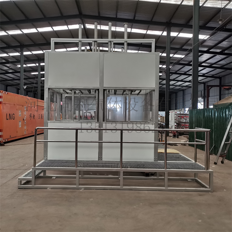 充装柜由控制柜、悬臂柜、高压阀门、止回阀、抗震压力表等装配而成。是整个充装系统的关键核心部位,用于控制各条充装管路及瓶组的放空及抽真空的自动操作,作业人员设置好配置参数即可实现一键充装,杜绝作业人员与高压阀门直接接触,大幅提高作业安全性能,充装柜配置了远程自动停泵功能,当充装压力达到预设压力值或监测到气体温度过低,低温泵自动减速直至停泵,防止了出现超压充装及低温充装的现象