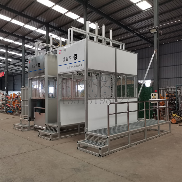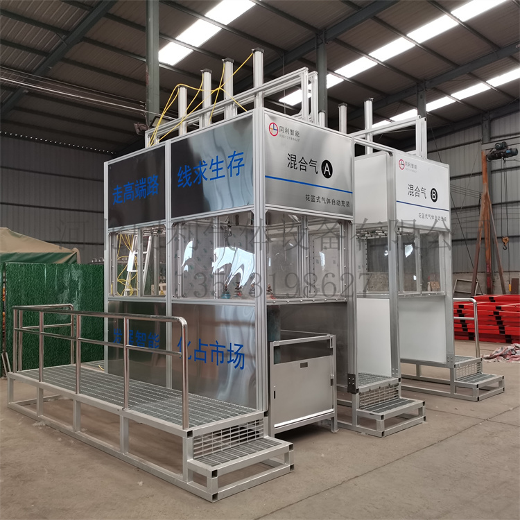 针对目前行业现状结合各气体公司需求,我公司推出花篮式气体自动充装系统,从各角度围绕“安全、高效、智能”的设计理念,经过潜心研发推出的一种新型气体充装方式,该系统主要包含花篮式充装平台、自动充装柜以及自动低温泵撬,可应用于老厂技术改造及新厂设计建设。充装平台包含左右各2个工位,成田字形布置,每个工位可设置12、16、20瓶,单次单侧充装完成16、32、40瓶。钢瓶分拣完成装上气瓶散装格用叉车运送到工进行充装,可减少人工搬运,效率高,操作安全,降低劳动强度。