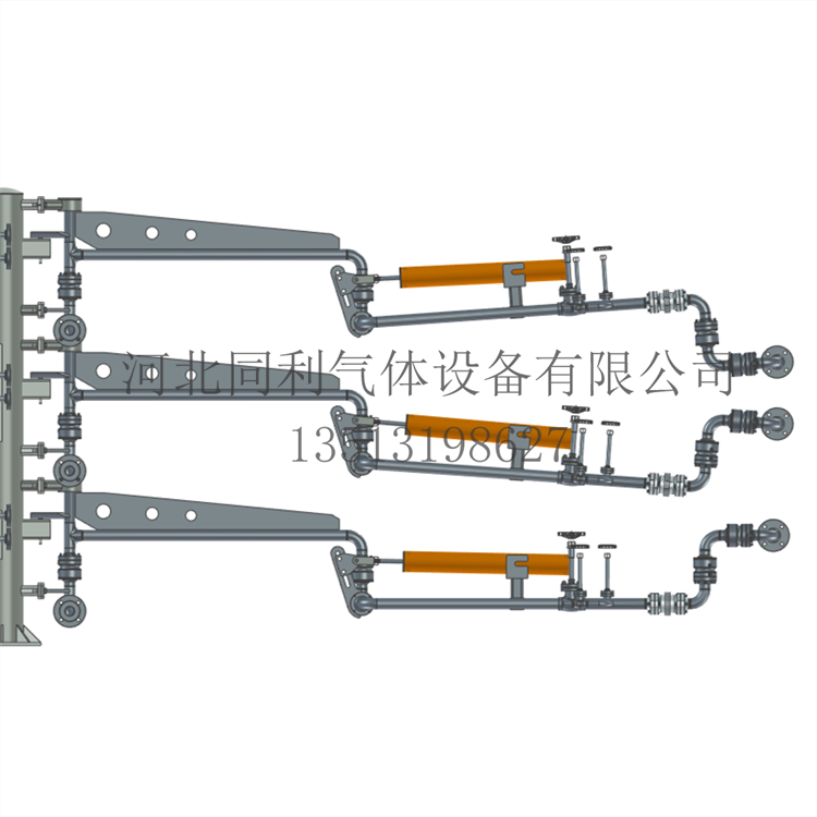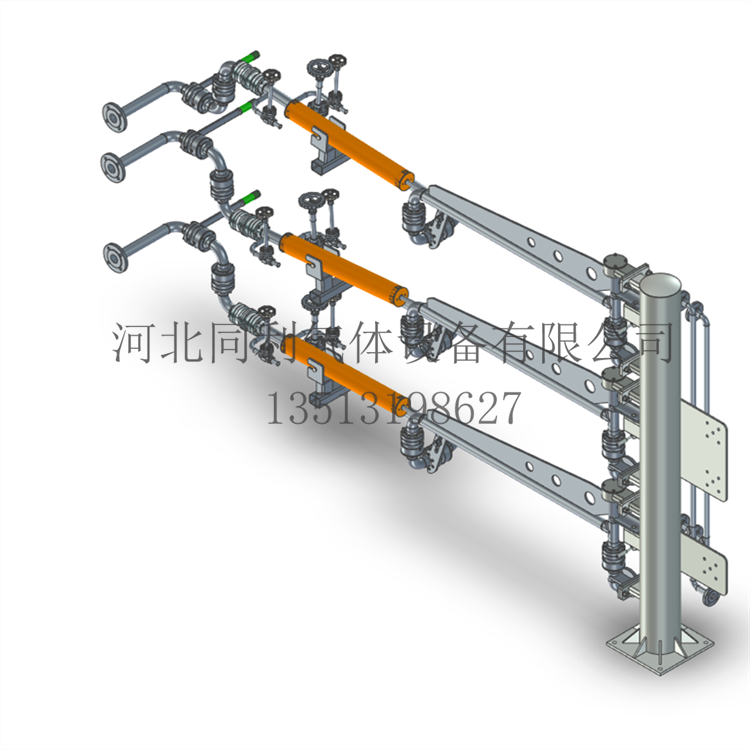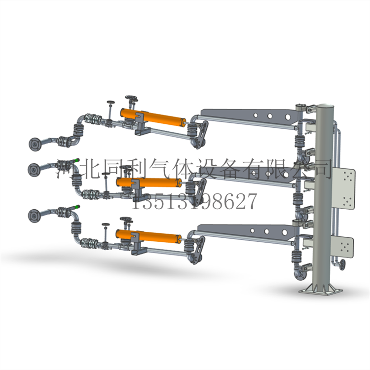 LNG鹤管、低温装车臂由立柱、液相臂、气体回收臂、平衡装置、氮气吹扫装置、导静电装置、旋转接头以及紧急切断阀等机构组成。
