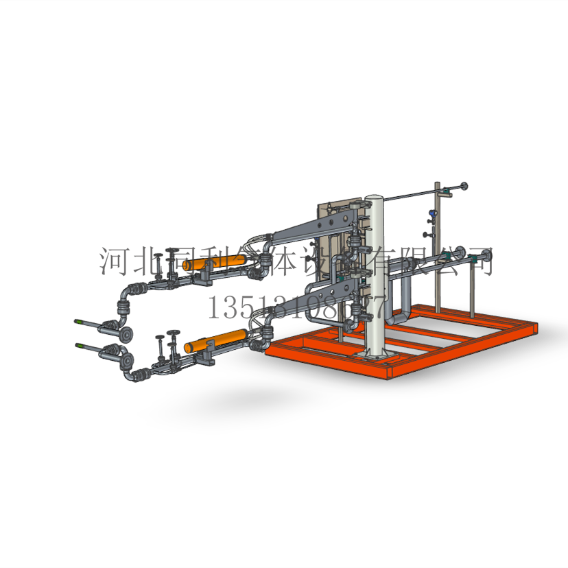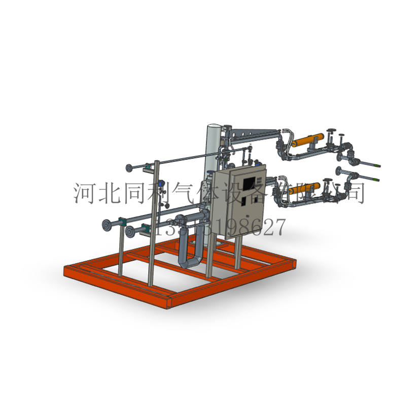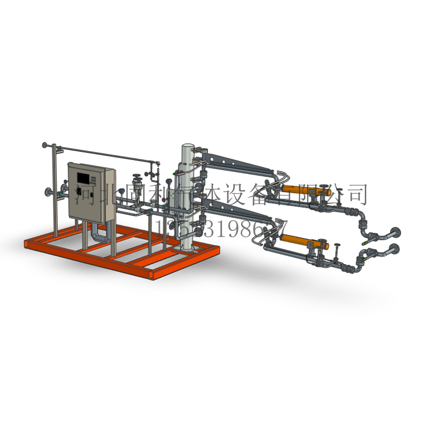 装车液相线依次安装质量流量计、流量调节阀、气动切断阀、温度变送器以及压力变送器,然后连接液相装车臂;装车气相线依次安装气动切断阀、温度变送器以及压力变送器,然后连接气相装车臂;系统内还配置静电控制器及接地装置,保证装车时槽车能够可靠地接地。同时在液相线和气相线上安装安全阀,橇装架外侧安装专用的LNG批量控制器和紧急停车按钮,批量控制器连接橇内所有控制阀门、温度变送器、压力变送器、质量流量计等,组成装车控制系统。